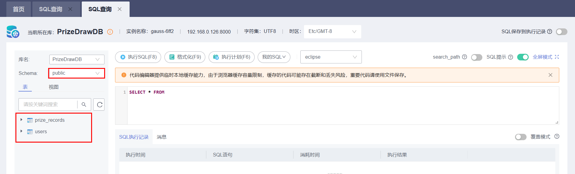 代码运行成功之后,我们在数据库 SQL 查询页面,可以看到代码中创建的用户表和抽奖记录表: