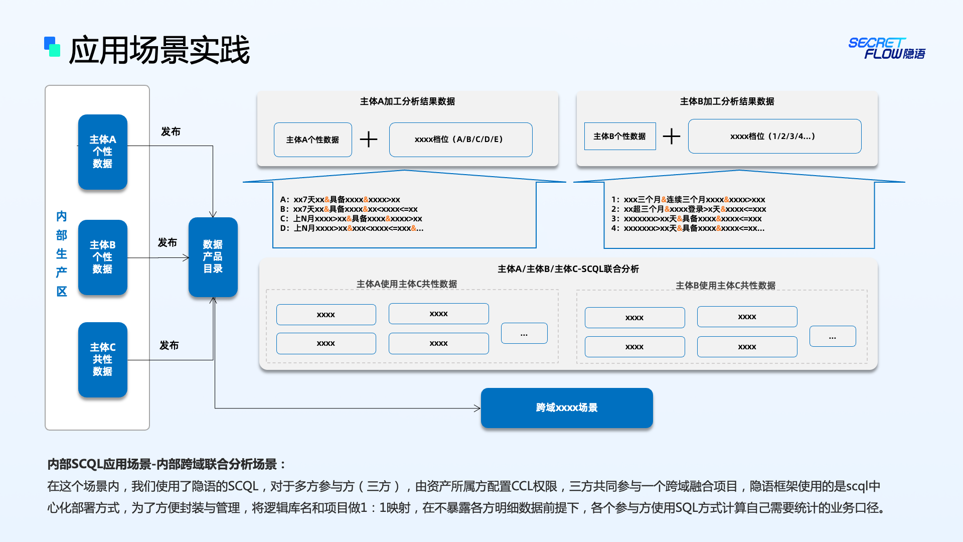在该场景中,我们通过隐语的 SCQL 能力实现了跨域数据的联合查询: