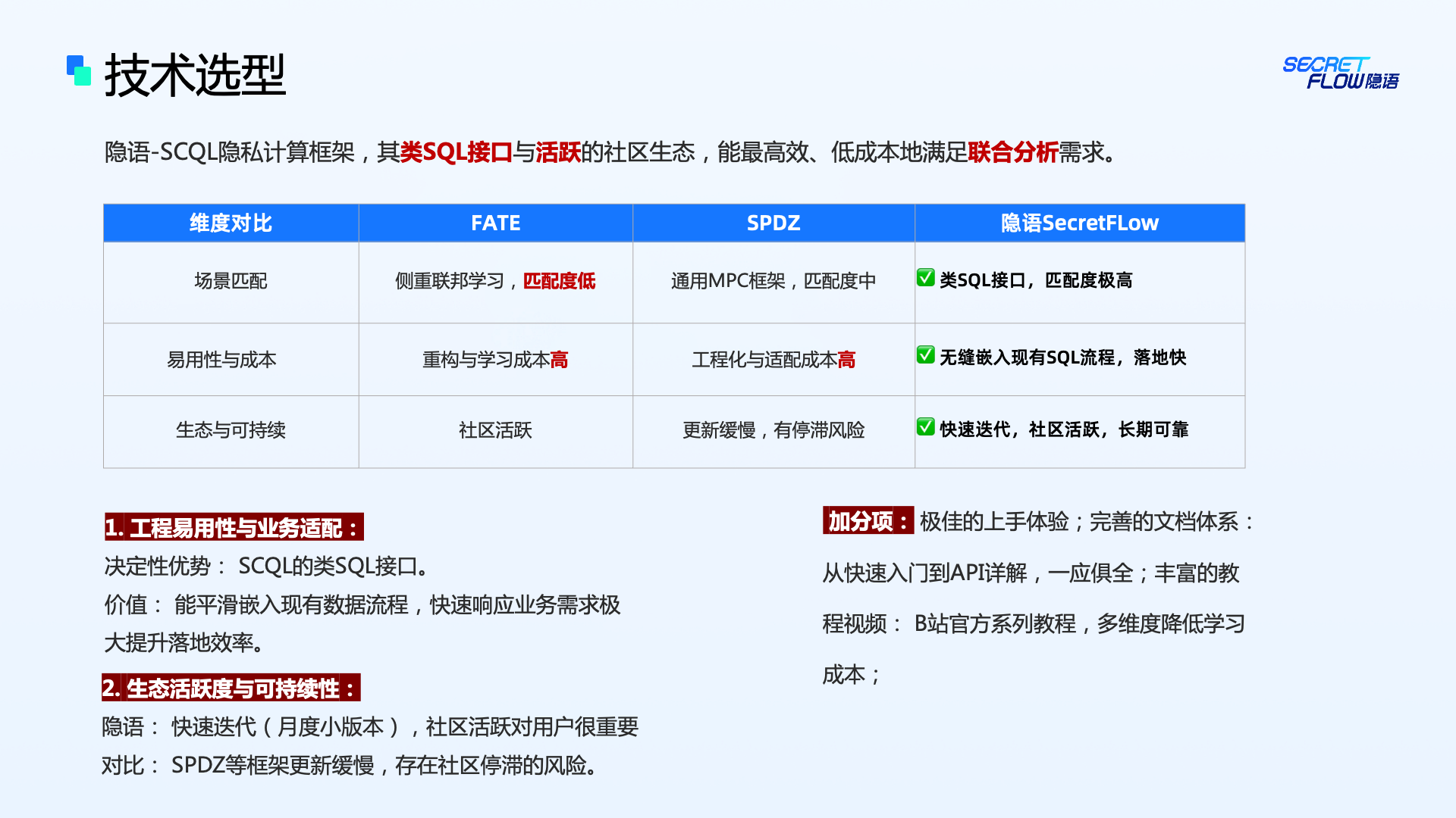 既然说到这里,也跟大家分享下我们技术选型的经验,在项目初期进行技术选型的时候,我们其实对市面上主流的隐私计算框架做了比较全面的调研和初步验证。