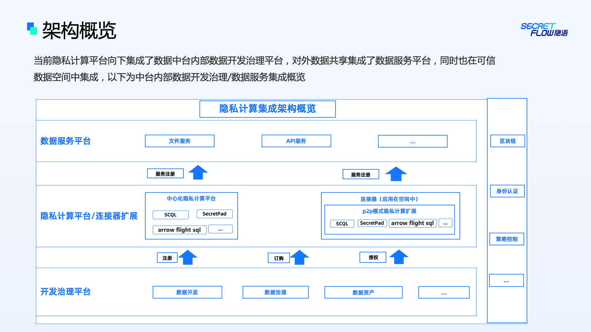 在部署模式上,平台内部采用 中心化部署,外部则基于 P2P 模式。外部架构也有进一步的演进:我们正在与可信数据空间对接,并计划通过连接器打通更多可信协同能力。