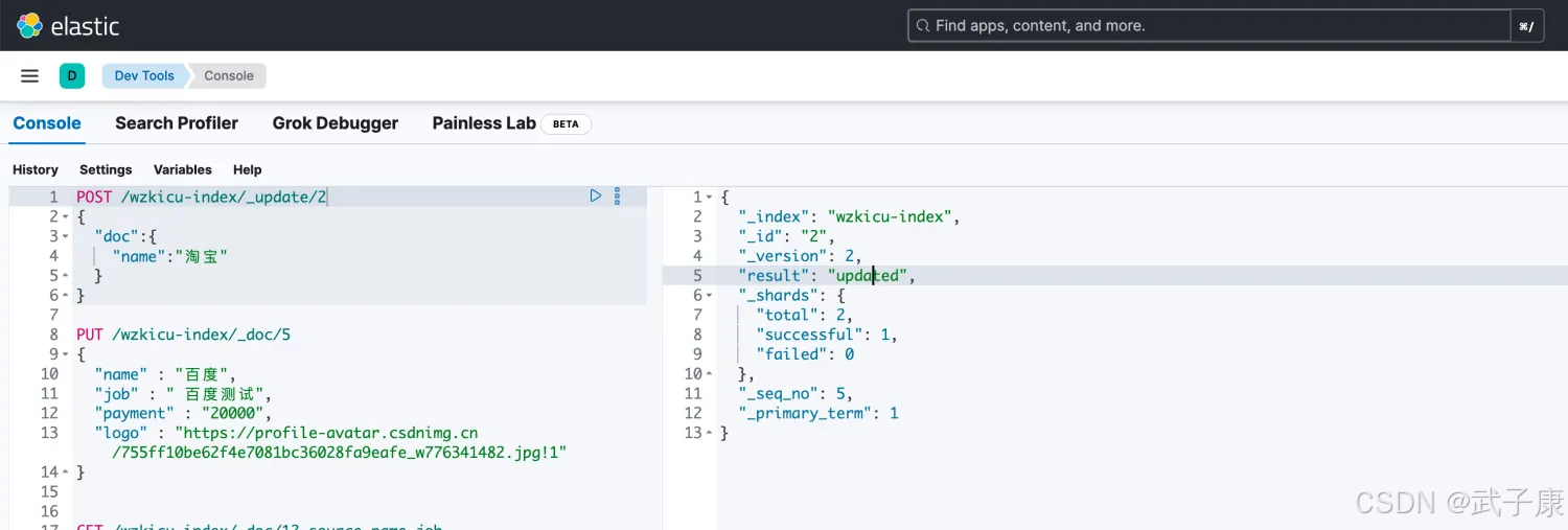 ES 可以使用 PUT 或者 POST 进行更新,如果指定 ID 存在,则执行更新操作。注意: