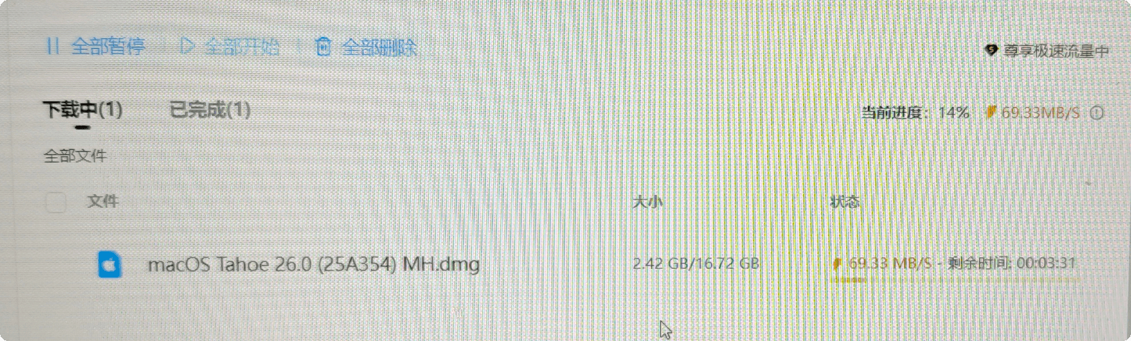 结果……芜湖!千兆带宽终于发力了,下载速度瞬间飙到 77MB/秒!我感动得差点哭出来。