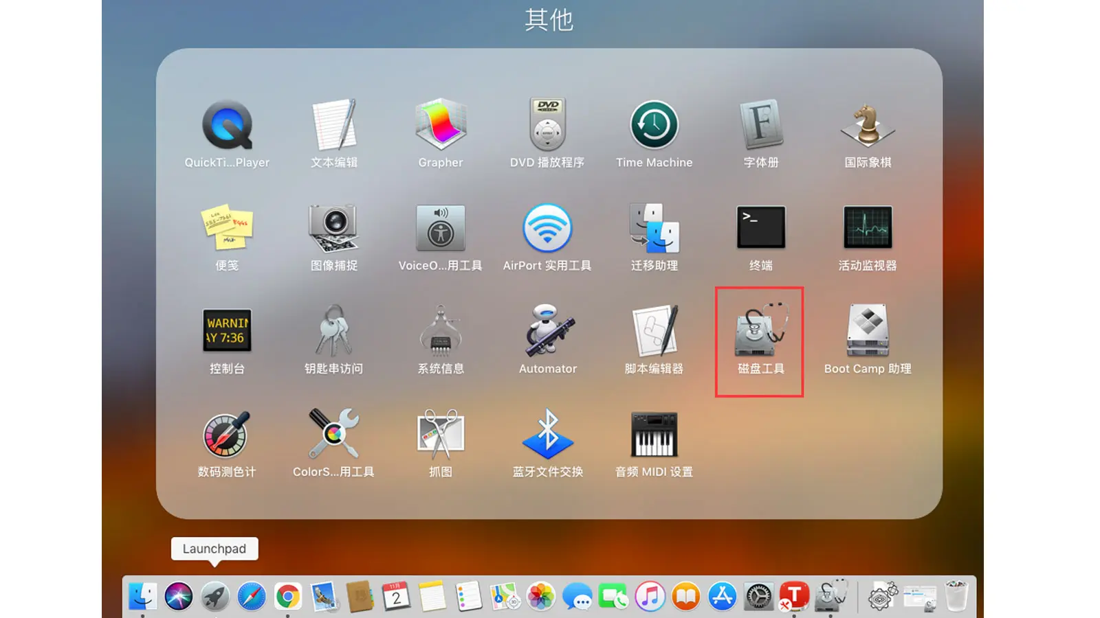 1、点击屏幕左上角苹果菜单,选择“启动台”,在“其他”文件夹中打开“磁盘工具”。