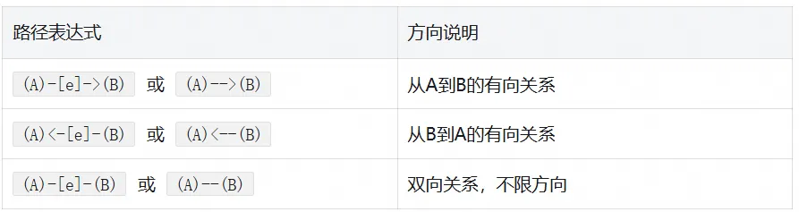 路径描述的语法遵循直观的方向性表达。(A)-[e]->(B) 表示从 A 到 B 的有向边,(A)<-[e]-(B) 表示从 B 到 A 的有向边,(A)-[e]-(B) 表示双向边(不限制方向)。用户可以为路径中的每个节点和边命名变量,这些变量可以在后续的 project 语句中使用。路径可以连接多个节点和边,形成多跳路径,比如 (start)-[e1]->(mid)-[e2]->(end)。