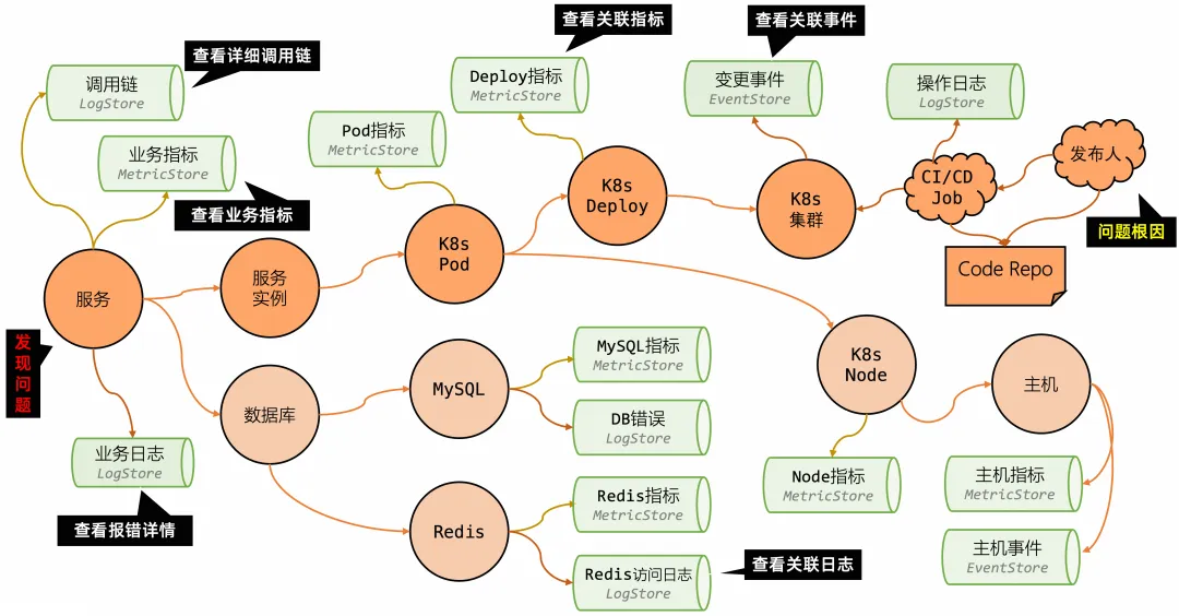 端到端的根因溯源: 与影响分析相反,当某个底层服务出现问题时,可以向上游回溯,快速定位是哪个业务或变更触发了异常,实现精准的根因定位。