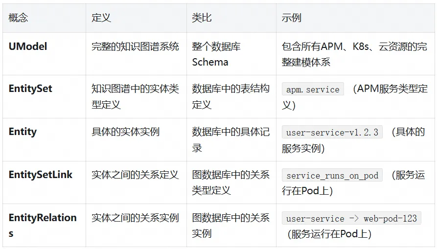 UModel (知识图谱)├── EntitySet: apm.service (类型定义)│ ├── Entity: user-service (实例1)│ ├── Entity: payment-service (实例2)│ └── Entity: order-service (实例3)├── EntitySet: k8s.pod (类型定义)│ ├── Entity: web-pod-123 (实例1)│ └── Entity: api-pod-456 (实例2)└── EntitySetLink: service_runs_on_pod (关系定义) ├── Relation: user-service -> web-pod-123 └── Relation: payment-service -> api-pod-456