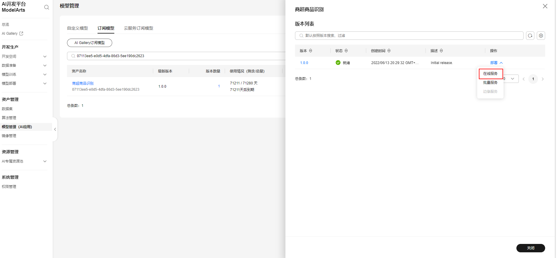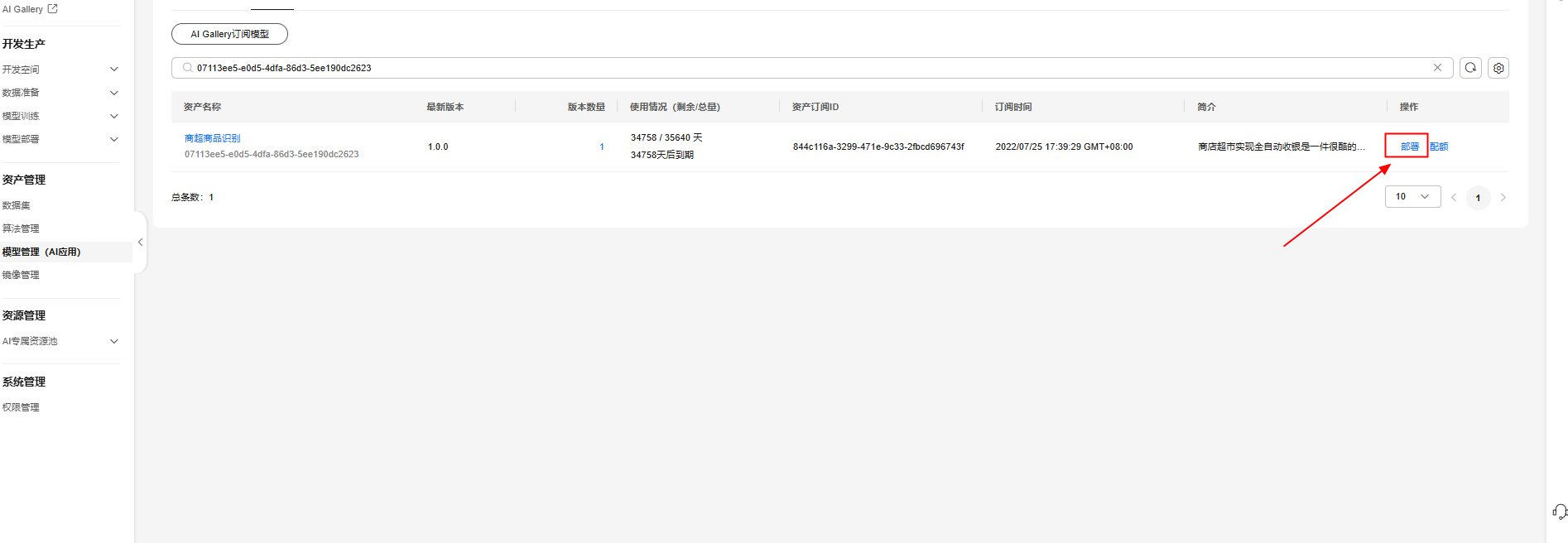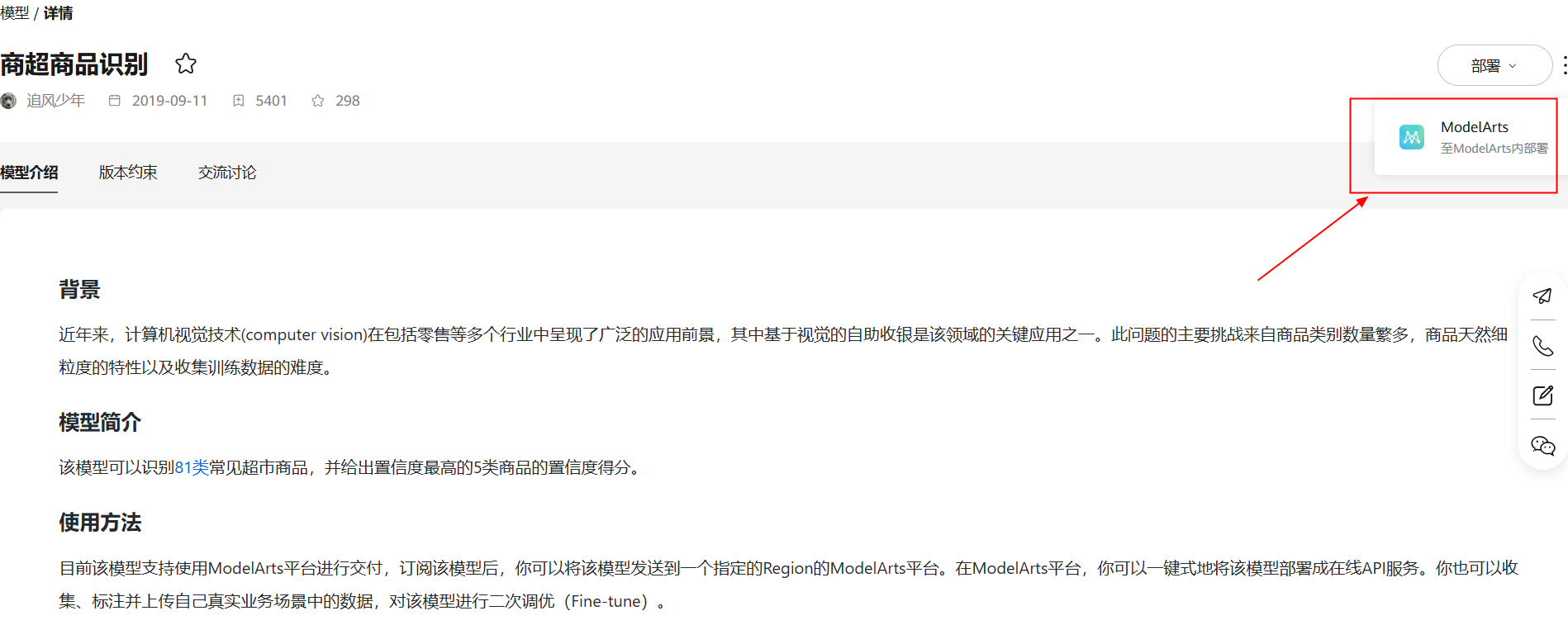 点击商品商超模型后选择部署->至 ModelArts 内部署。