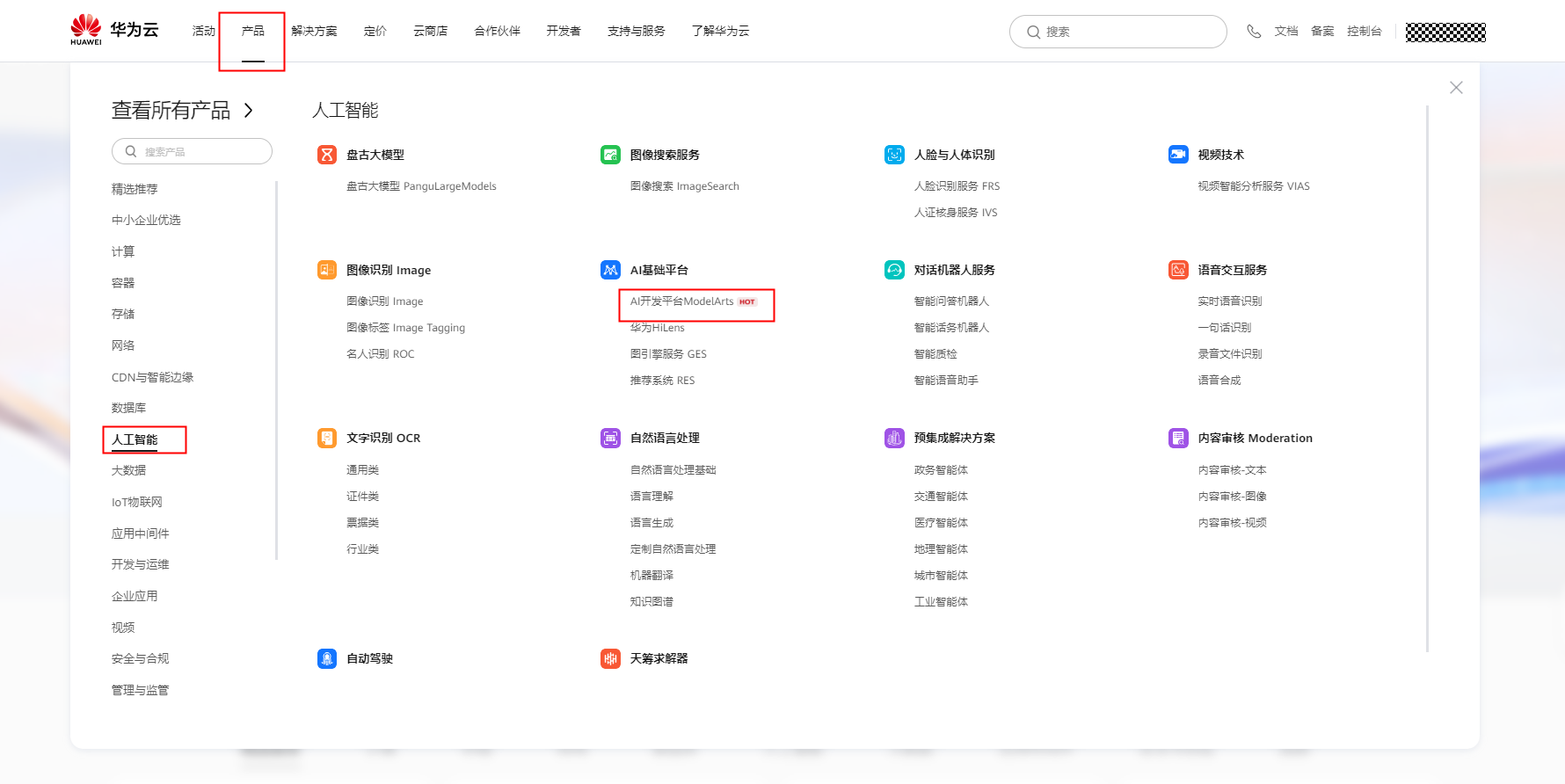 本案例中,使用华为云 ModeArts 部署模型,并且在云主机上进行模型调用以及测试。在浏览器中输入华为云网址:https://www.huaweicloud.com/进入华为云首页。1. 在华为云的首页右上方,点击“登录”,在弹出的对话框中输入自己的用户名和密码。2. 在华为云首页,依次选择“产品”->“人工智能”->“AI 开发平台 ModelArts”,进入 ModelArts 页面。