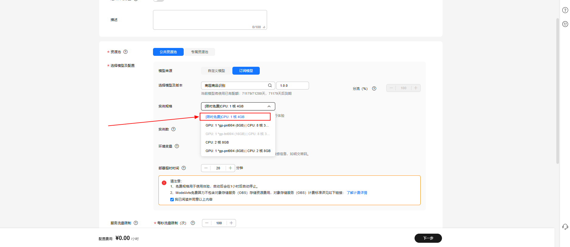 进入到模型部署界面后开始部署,选择公共资源池,模型来源选择订阅模型,实例规格选择限时免费 CPU:1 核 4G。