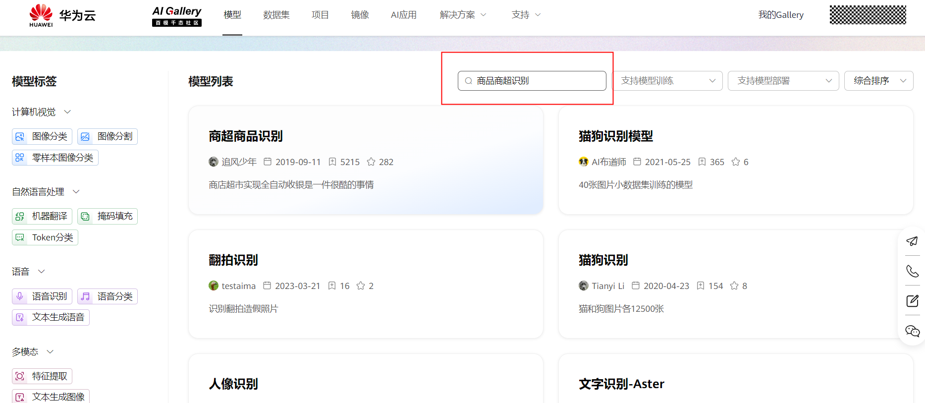 进入到 AI Gallery 社区后,在界面上方点击模型,进入模型广场,在搜索框输入:商品商超识别,进行模型搜索。