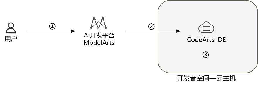 说明:① 用户登录华为云 ModelArts 部署模型;② 登录云主机编写测试代码;③ 模型部署完毕,在云主机进行调用测试。