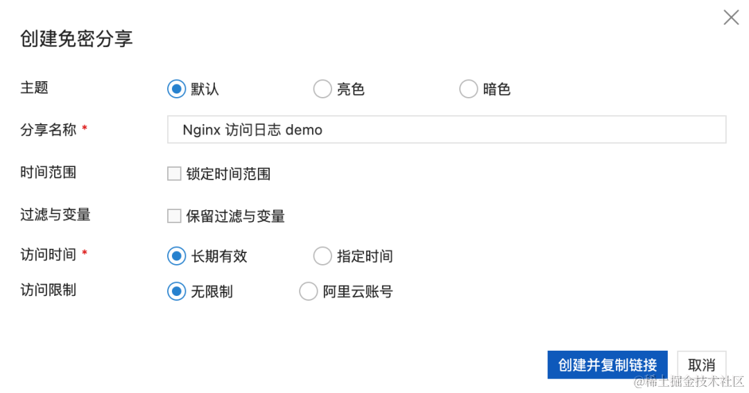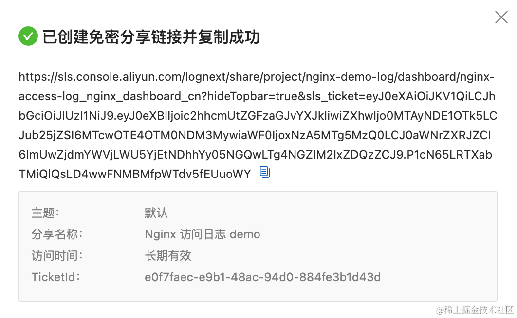 因此除了全新的免登方案外,我们基于 Ticket 机制提供了仪表盘的免密分享功能,支持在控制台创建免登链接,无需调用 SDK 实现,未来也会支持日志查询页面的免密分享。