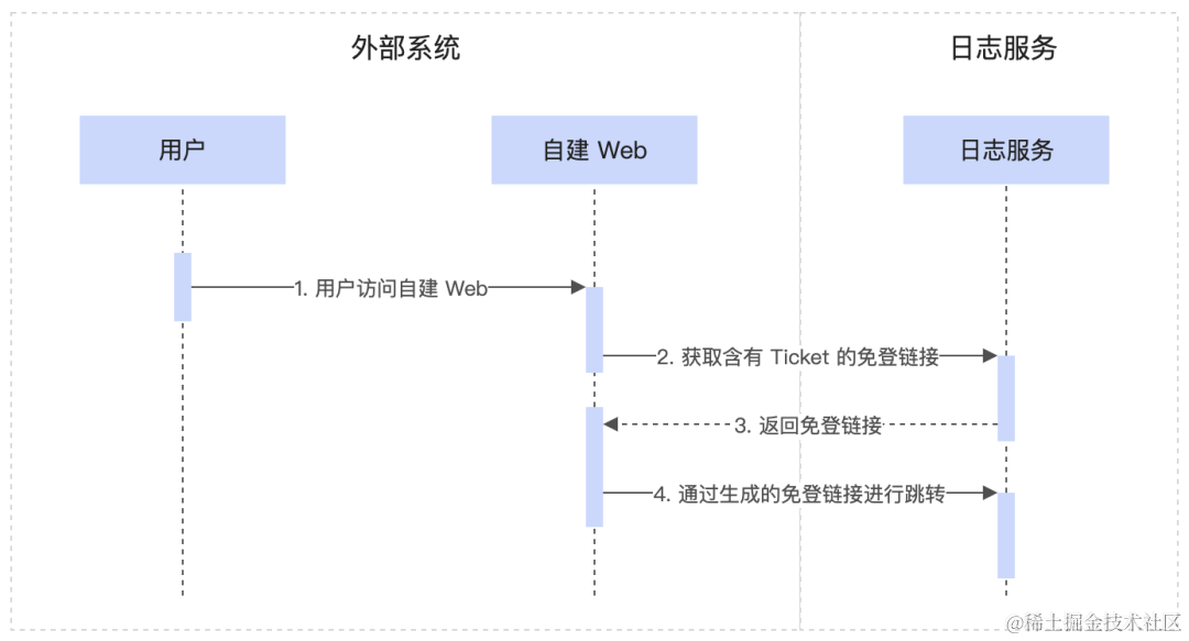 该 Ticket 方案登录过程只需要两步,第一是调用 SDK 获取免登链接,第二是使用链接直接访问 SLS,在此过程中没有任何浏览器重定向操作。