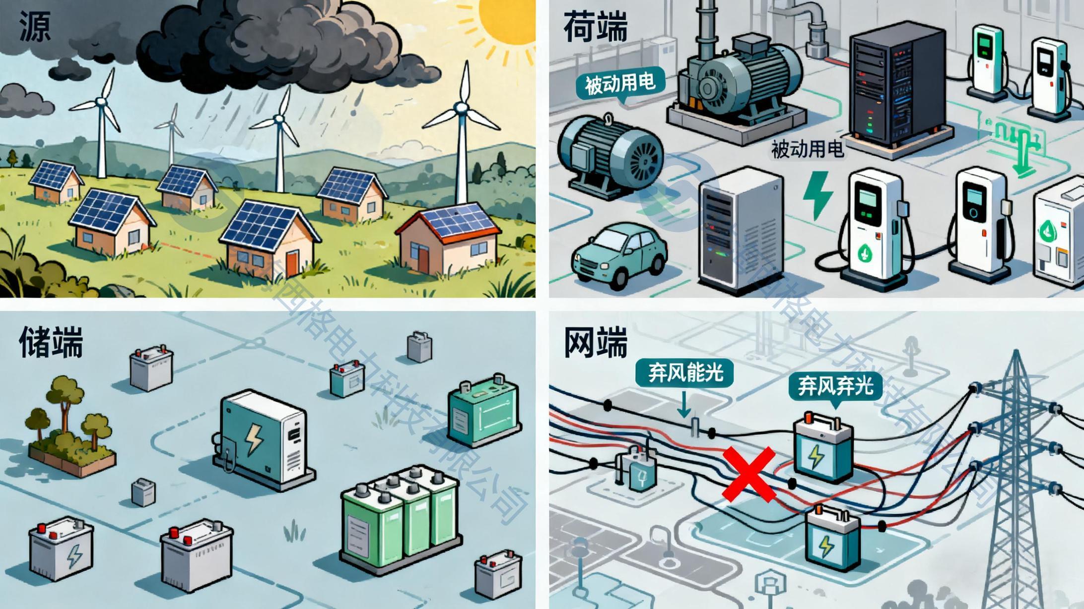 从“储”与“网”端看,分布式储能、用户侧蓄电池等资源分散分布,缺乏统一调度机制,而配电网的承载能力有限,难以单独应对局部区域的“源荷失衡”,导致部分新能源发电因“消纳困难”被迫弃风弃光。