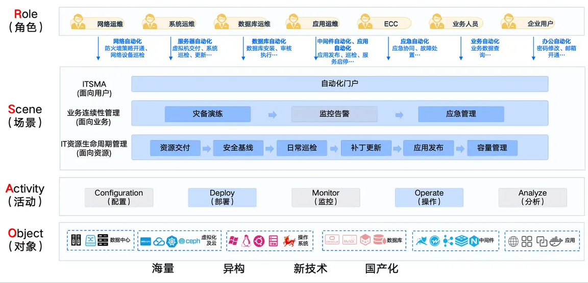自动化运维业务架构分为基础设施即对象层、活动即原子层,场景层即 SaaS 层以及角色层,构建服务于角色、注重用户体验、合规安全,同时可持续横行、纵向扩展的灵活架构,满足当前基金公司敏态发展与管理的需求: