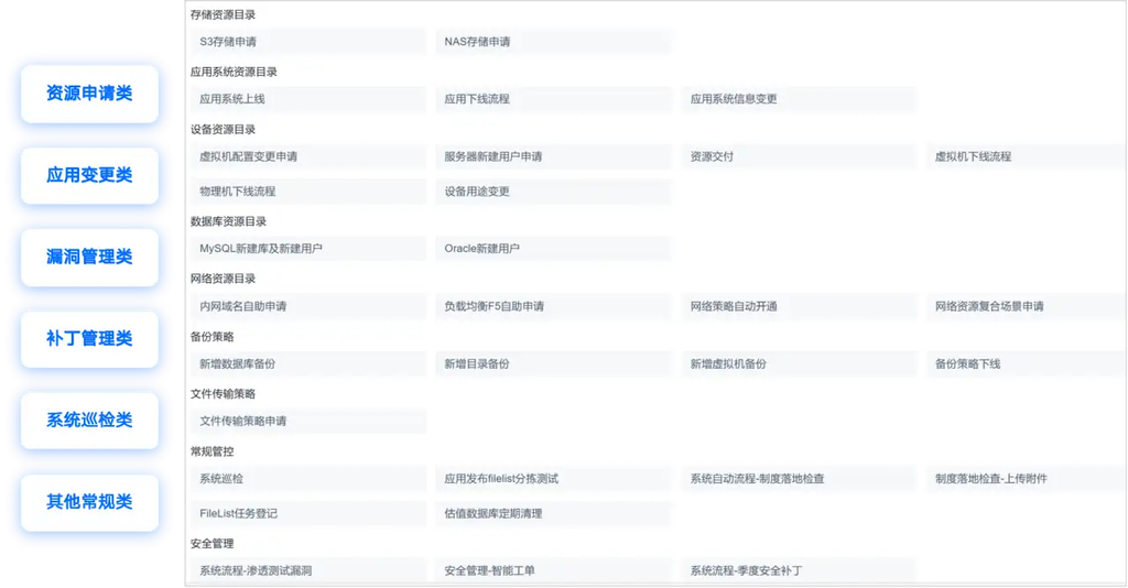 IT 资源的管理分散在不同的平台并且由不同的部门进行管理,当产生一个资源申请需求时会面临跨系统、跨部门的复杂协作,同时需要层层严谨的评估审核,导致整个资源交付的周期较长,无法满足敏捷化的管理模式。若通过自动化+ITSM流程相结合的方式,则可以将整个过程实现规范化管理并大大减少交付周期。