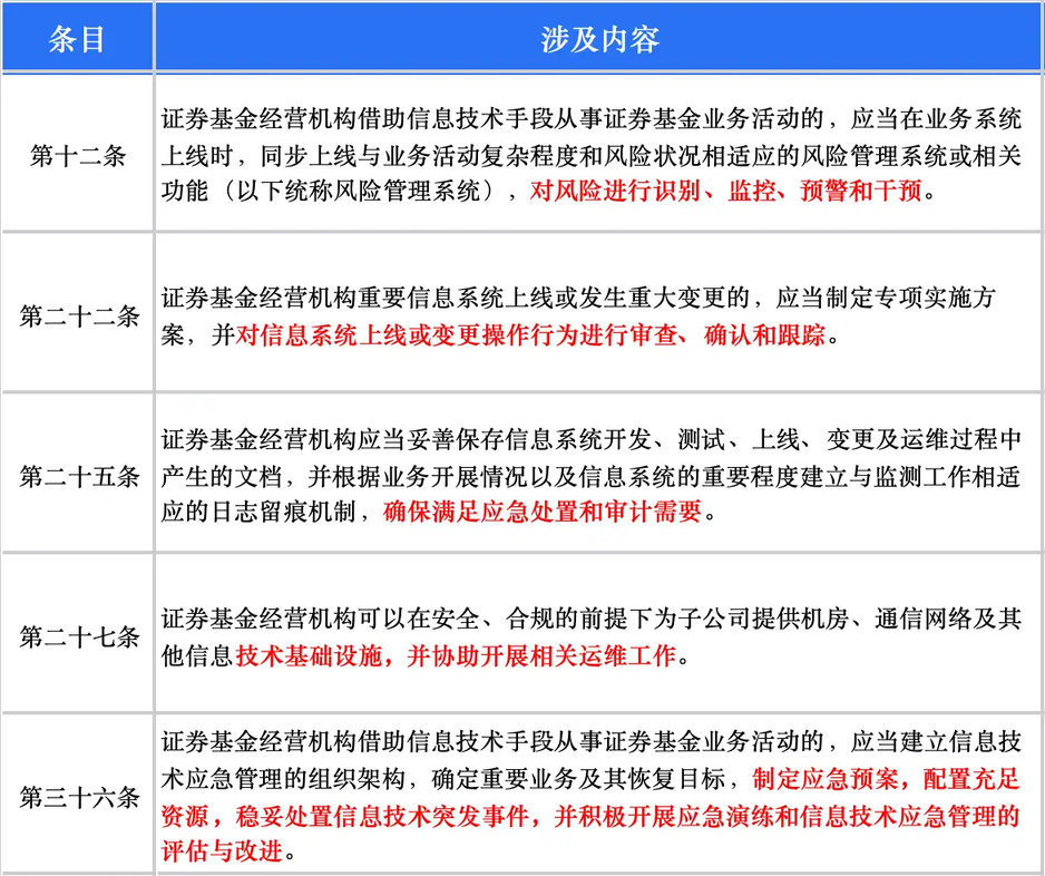 因此中国证券监督管理委员会面向境内所有为证券基金业务活动提供信息技术服务的机构发布了《证券基金经营机构管理办法》,主要从重要信息系统的开发、测试、集成及测评,以及重要信息系统的运维及日常安全管理两方面提出了管理要求与办法。其中针对“重要信息系统的运维及日常安全管理”部分的管理条目如下,涉及到监控告警、系统变更、应急预案管理与应急处置、基础设施运维等场景: