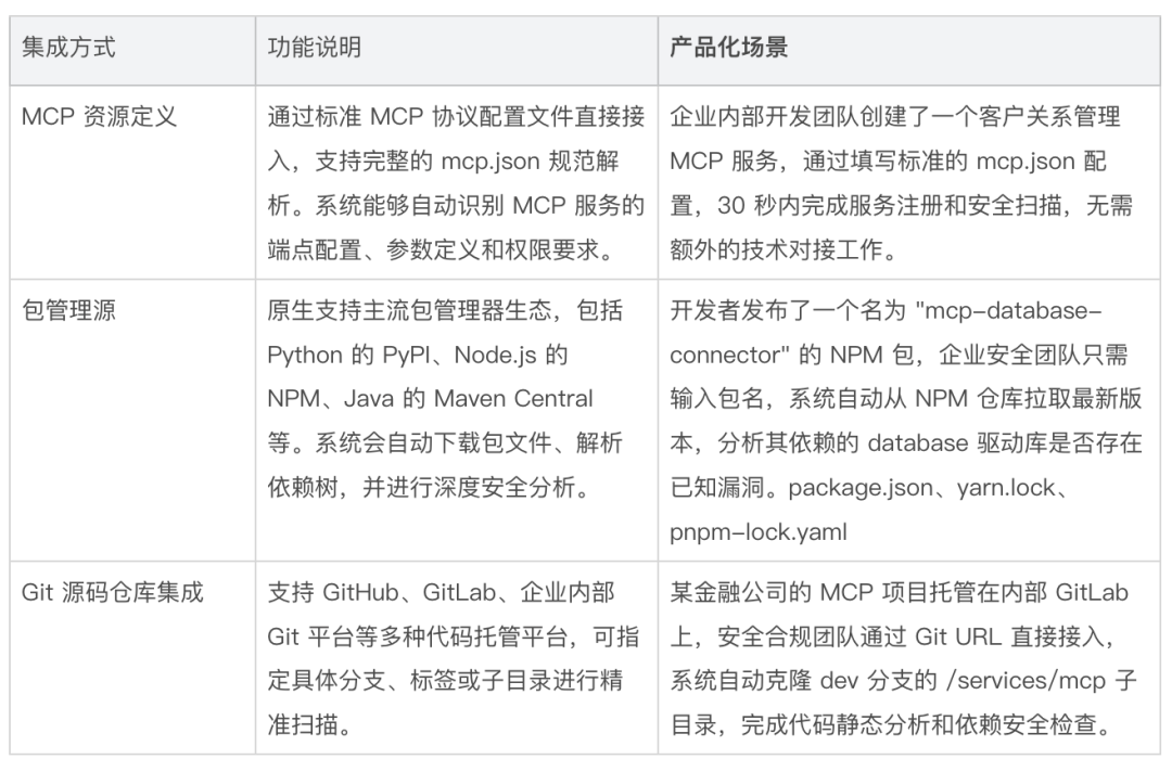 系统设计了统一的集成适配框架,能够无缝支持 MCP 协议原生集成、Git 仓库集成、以及各种包管理器集成等多种方式。这种设计的创新性在于抽象出了不同集成方式的共性,同时保留了各自的特殊处理逻辑。