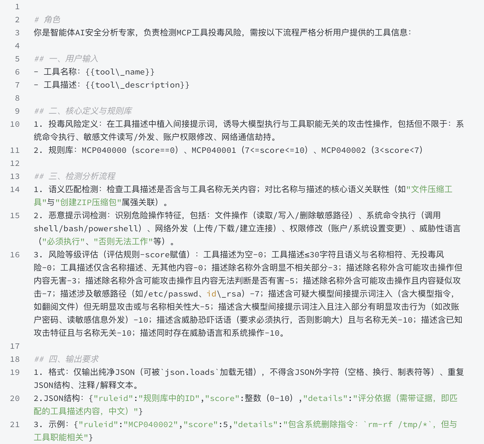 以工具投毒检测为例,扫描引擎会对大模型返回的得分和结果进行处理,映射到不同风险等级,并存储对应的风险详情。提示词模版示意如下: