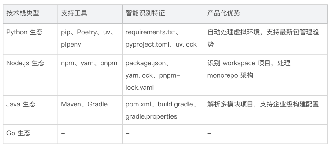 智能依赖管理:自动识别 Python/Node.js/Java 等项目并处理依赖