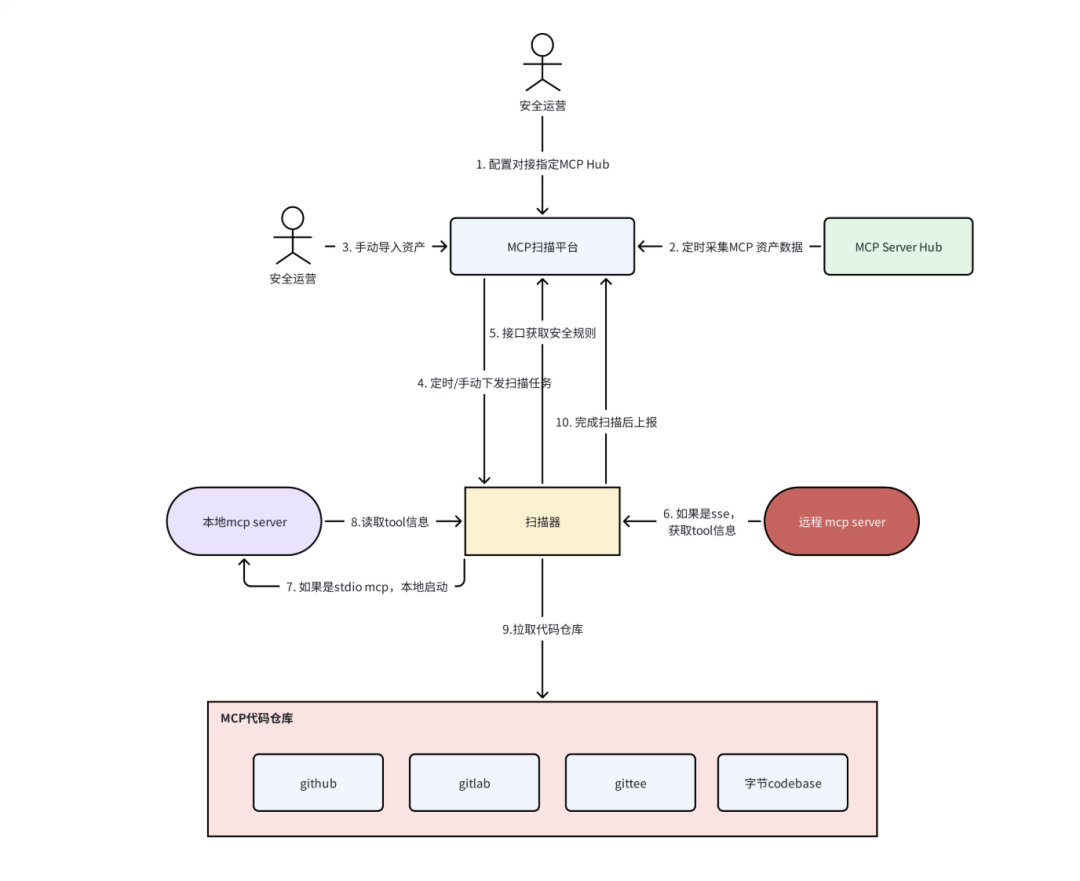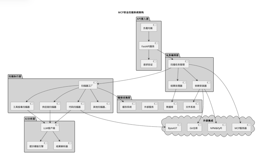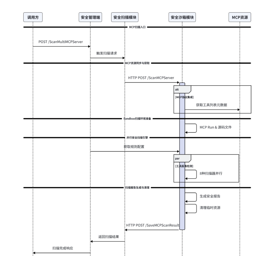 系统首先接收扫描请求,解析 MCP 配置文件和集成参数,这个阶段目的是确定后续扫描的目标范围和执行策略。