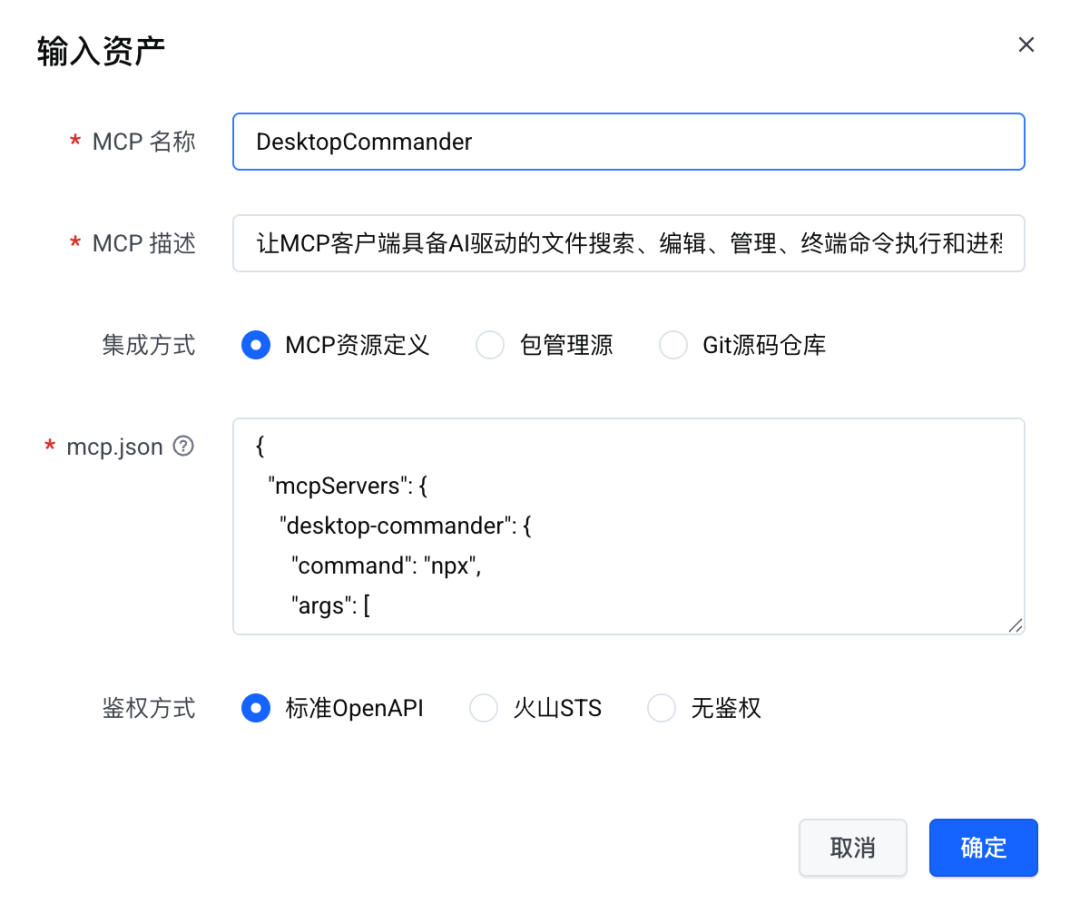 系统支持自动/手动导入 MCP 资产,自动导入可以通过 OpenAPI 对接 MCP HUB 平台,将 MCP 资产同步;手动导入方式考虑多种集成类型,包括 mcp config.json、git 仓库代码、依赖包等方式,从而确保对现有的 MCP 类型都能够有良好的集成途径。