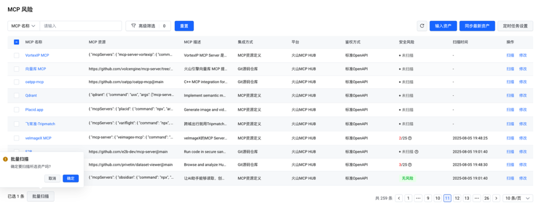 通过提供定时自动同步和手动触发同步两种资产同步方式,搭配灵活的扫描策略 —— 其中增量扫描聚焦新增或变动的资产、全量扫描覆盖所有资产,将这些资产管理与安全检测能力,深度融入 MCP 的资产准入、上架等关键环节,提前排查风险,确保资产从进入到正式上线的全流程安全。