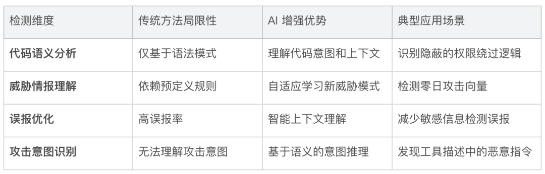 基于 AI 增强的检测能力体现在多个层面。语义级代码理解使系统能够超越传统的模式匹配,真正理解代码的业务逻辑和安全含义。自适应威胁学习让系统具备了持续进化的能力,能够通过学习新的攻击案例来提升检测准确性。