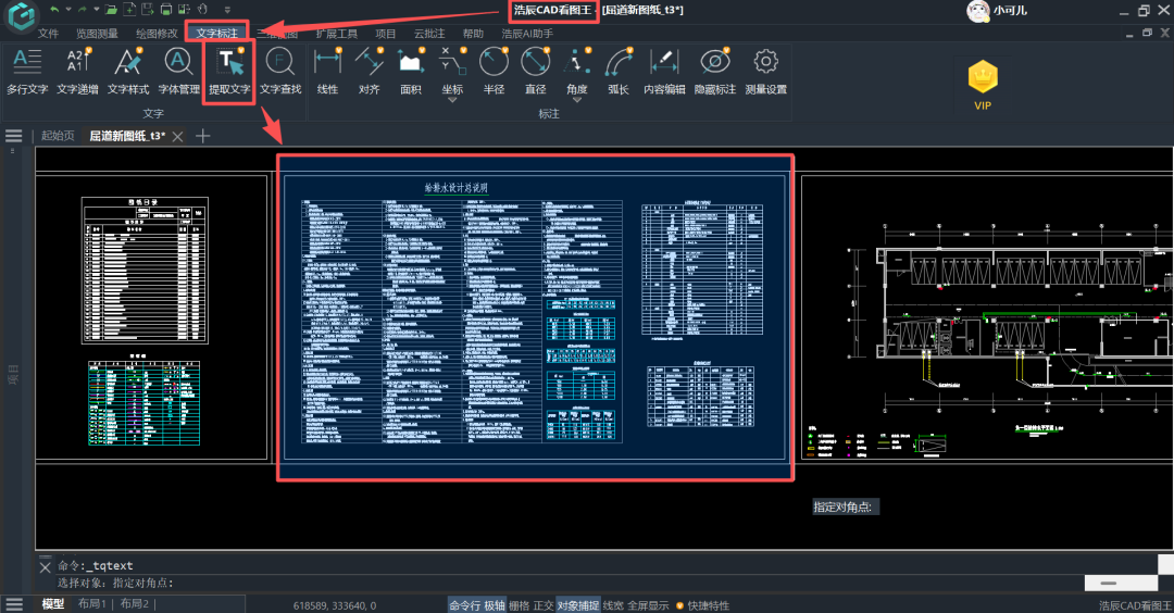 2、在【文字标注】菜单栏点击【提取文字】功能,并在 CAD 图纸中框选需要导出文字的部分,如下图所示;