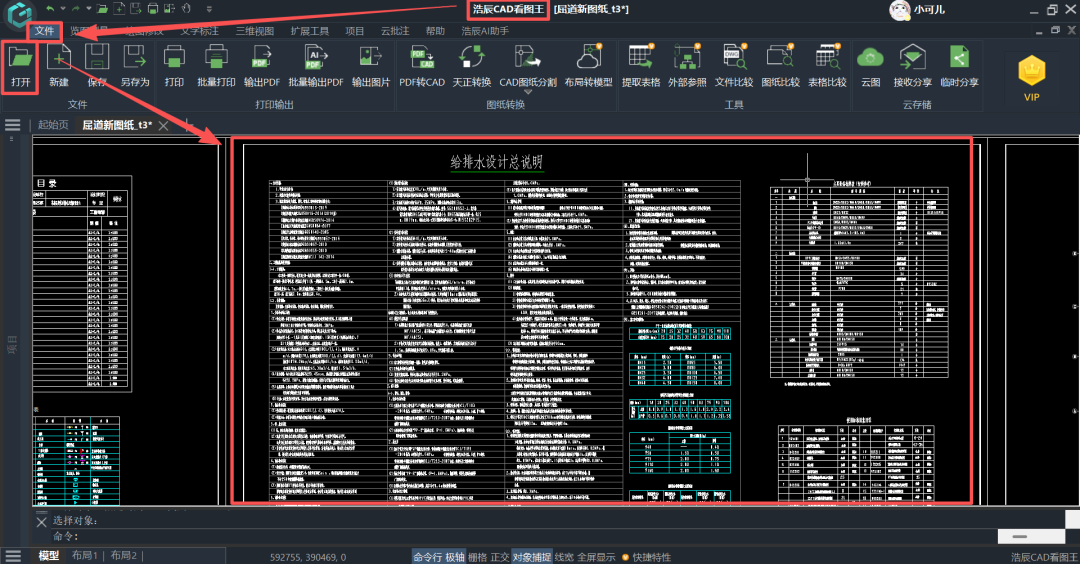 1、在浩辰 CAD 看图王电脑版中点击【文件】菜单栏的【打开】或者直接点击起始页上的【打开图纸/模型】选择要打开的 CAD 图纸,如果之前打开过,则该图纸模型会出现在起始页的缩略图中,直接点击即可打开,如下图所示,我们打开的 CAD 图纸中可以看到有大量的文字内容;