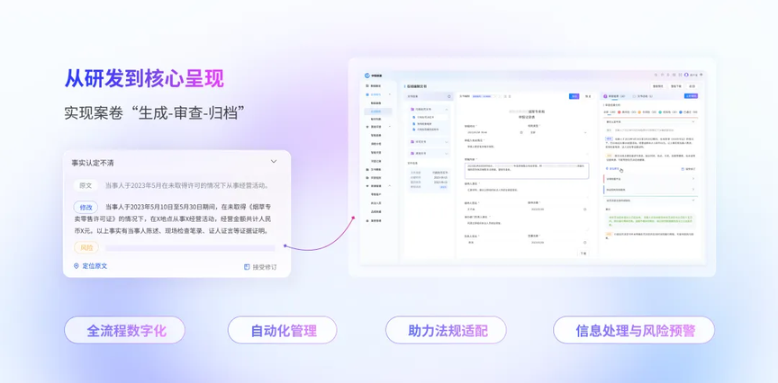 系统以人工智能技术为核心,致力于实现从案卷生成、审查到归档的全流程数字化、自动化管理,有效提升了执法工作的透明度、准确性和效率,为烟草专卖行政主管部门提供了一套可靠的技术保障。