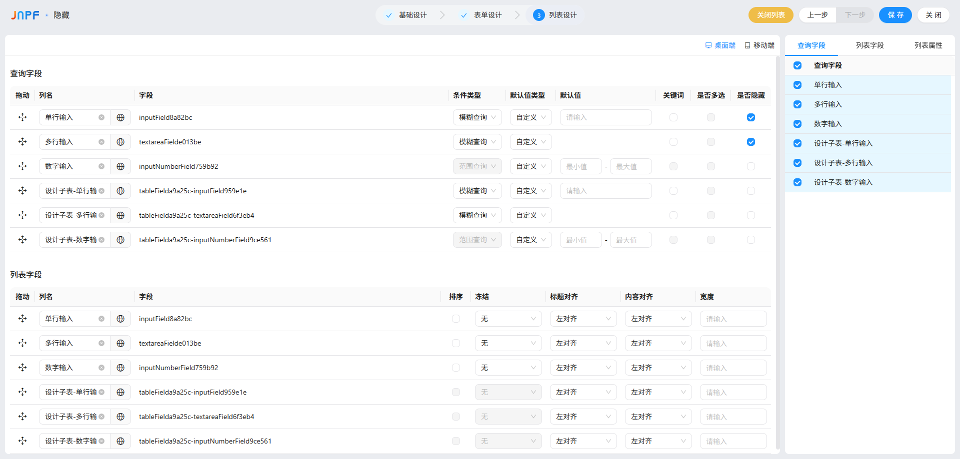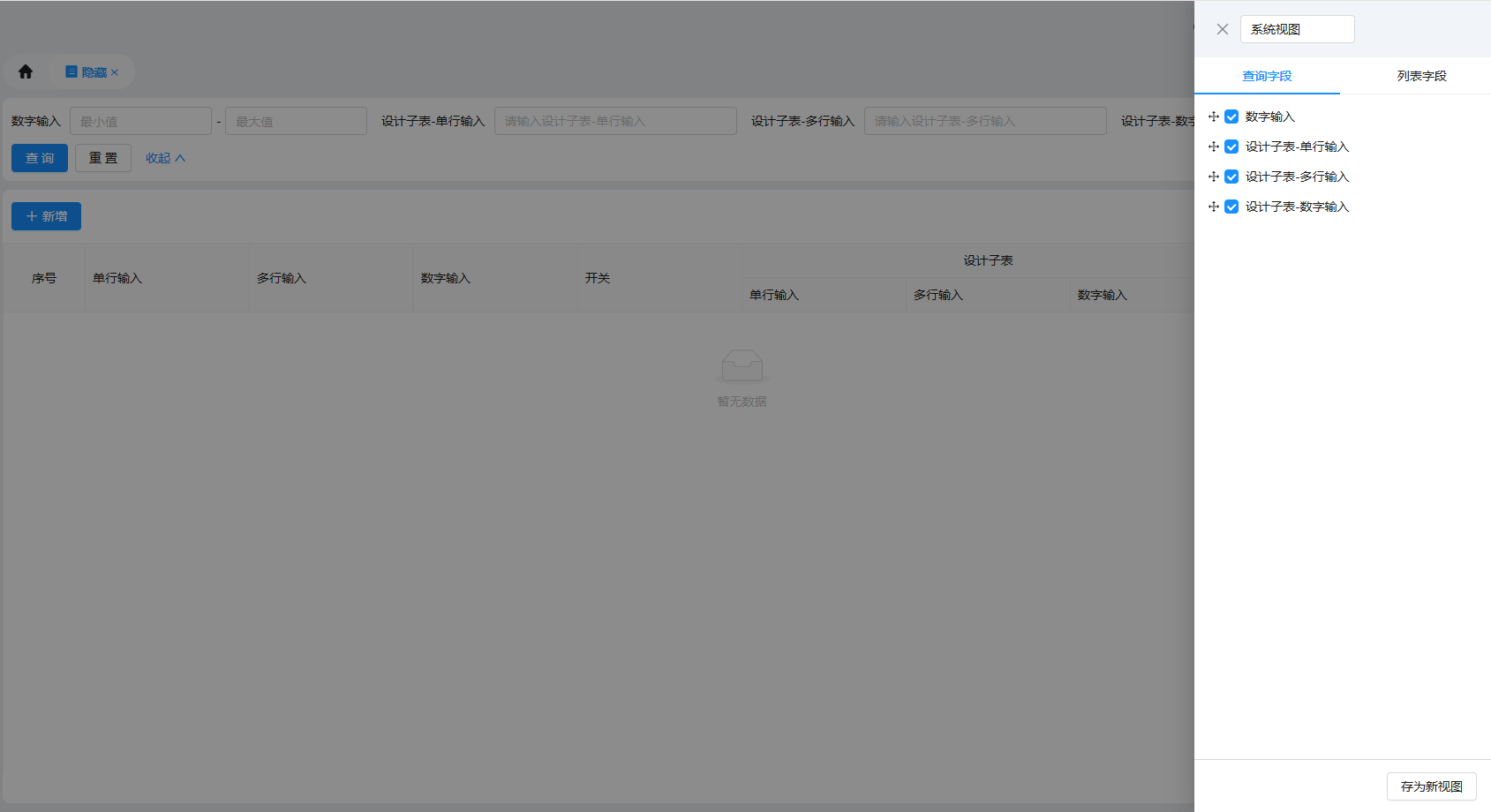 配置视图内容:查询字段:勾选需要的筛选字段(如 “单行输入”“数字输入”),设置是否隐藏、条件类型(模糊查询 / 范围查询);列表字段:勾选需要显示的列(如 “姓名”“部门”),调整排序、冻结、对齐方式和宽度;