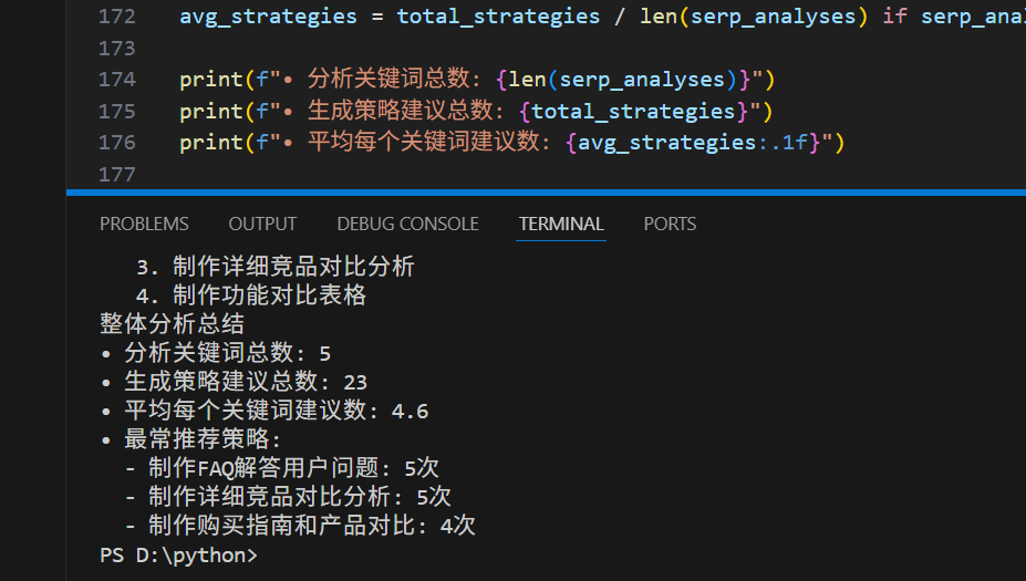 print(f"• 分析关键词总数: {len(serp_analyses)}")print(f"• 生成策略建议总数: {total_strategies}")print(f"• 平均每个关键词建议数: {avg_strategies:.1f}")