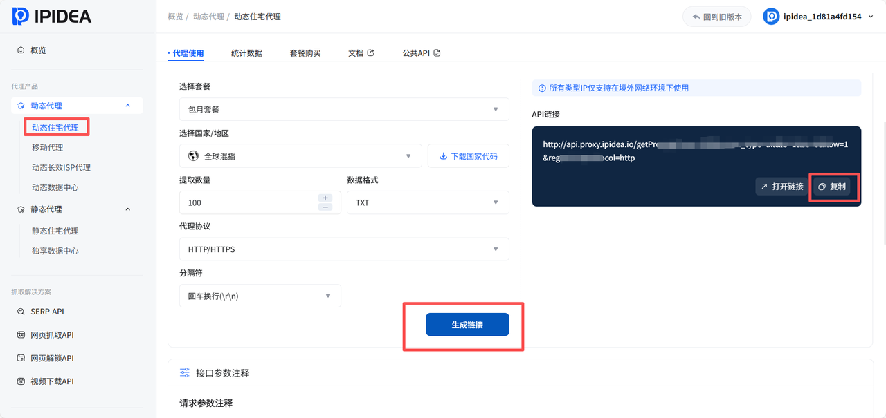 在 API 获取中选择动态住宅 IP,设置扣费方式、国家/地区、每次提取数量、代理协议和数据格式,点击生成链接。