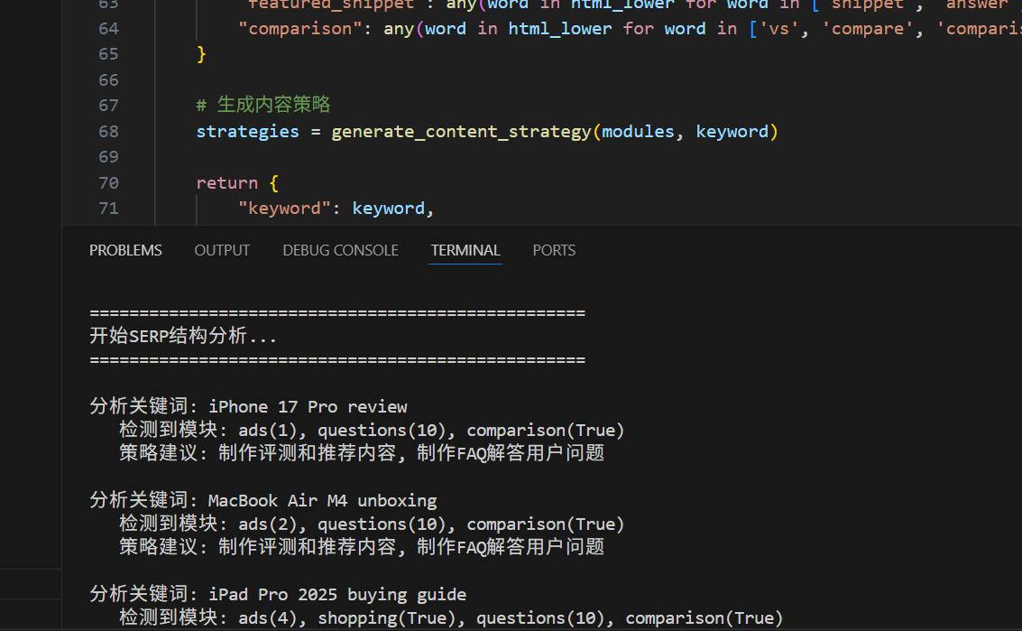 def generate_content_strategy_report(analyses): """生成内容策略报告""" print("SERP模块分析 - 内容策略报告") for keyword, analysis in analyses.items(): modules = analysis["modules"] print(f"\n关键词: {keyword}") # 显示发现的模块 active_modules = [] for module, value in modules.items(): if value and value > 0: display_name = { "ads": f"广告({value})", "shopping": "购物模块", "videos": "视频模块", "news": "新闻模块", "questions": f"相关问题({value})", "featured_snippet": "精选摘要", "comparison": "对比内容" }[module] active_modules.append(display_name) print(f"SERP模块: {', '.join(active_modules) if active_modules else '基础搜索结果'}") # 显示内容策略建议 print("内容策略建议:") for i, strategy in enumerate(analysis["strategies"], 1): print(f" {i}. {strategy}")