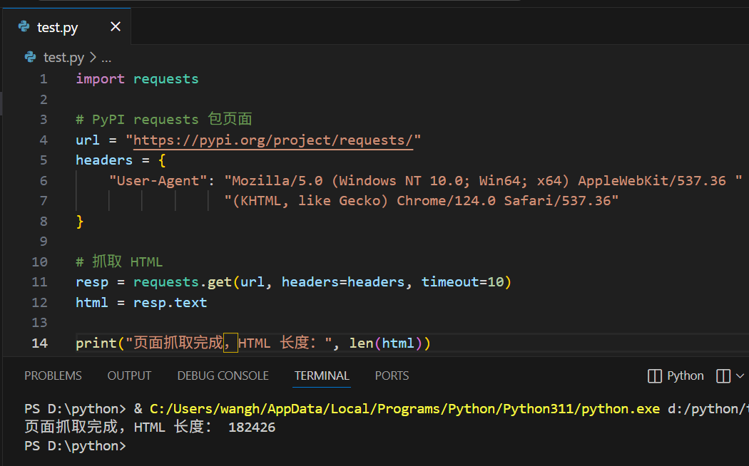 # -----------------------------# 3.1 抓取 HTML# -----------------------------url = "https://pypi.org/project/requests/"headers = {"User-Agent": "Mozilla/5.0 (Windows NT 10.0; Win64; x64) AppleWebKit/537.36 " "(KHTML, like Gecko) Chrome/124.0 Safari/537.36"}resp = requests.get(url, headers=headers, timeout=10)html = resp.text