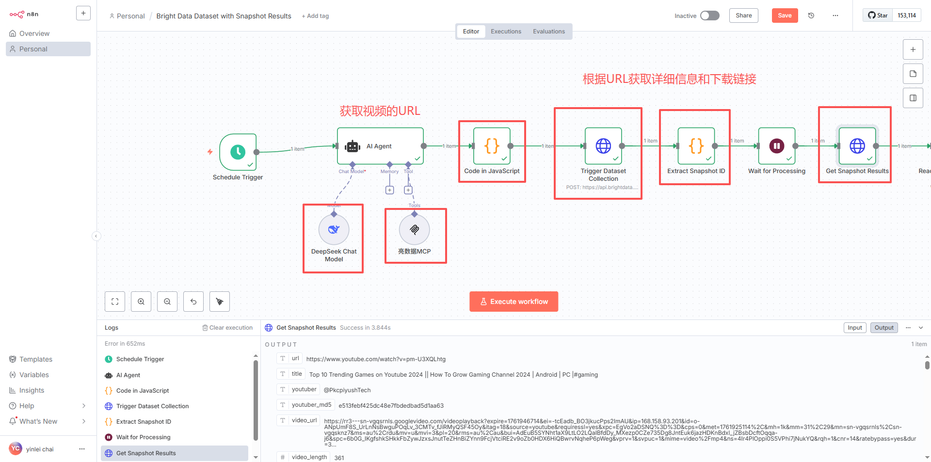如有需要我的完整工作流如下(当然记得替换你的 DeepSeek 的 key 和亮数据的 Key 调试后测试运行):