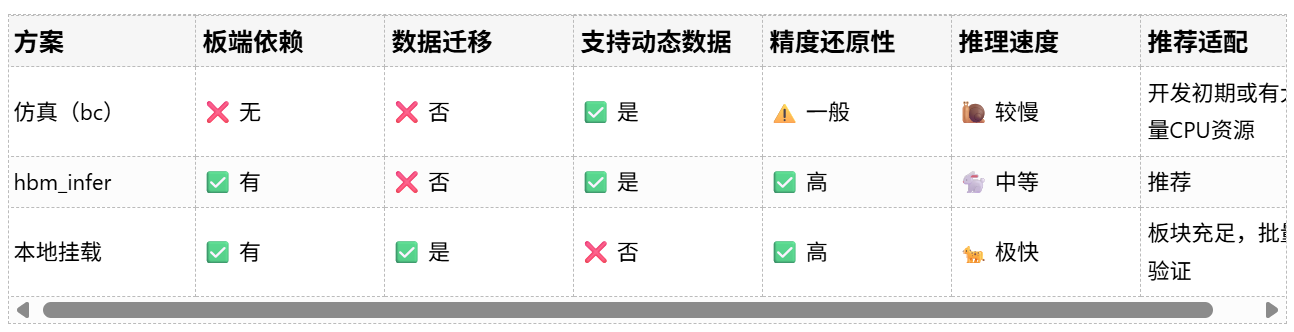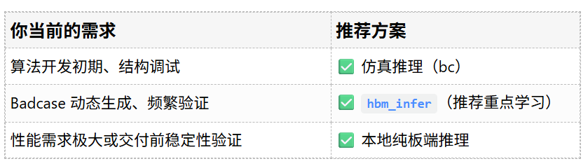 尽管三种方案各有应用空间, 在目前发布的 OE 包与官方示例中,对方案一/三已有说明与案例,而方案二虽然支持面广、功能强大,却缺少系统化教程,另外方案二 hbm_infer 是目前唯一能同时满足以下需求的解决方案: