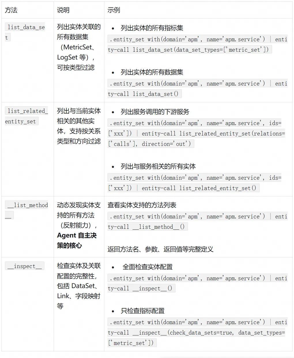如:查询某个服务实体支持哪些方法(__list_method__())、关联了哪些数据集(list_data_set())、与哪些其他服务有调用关系(list_related_entity_set())、配置是否正确(__inspect__())。