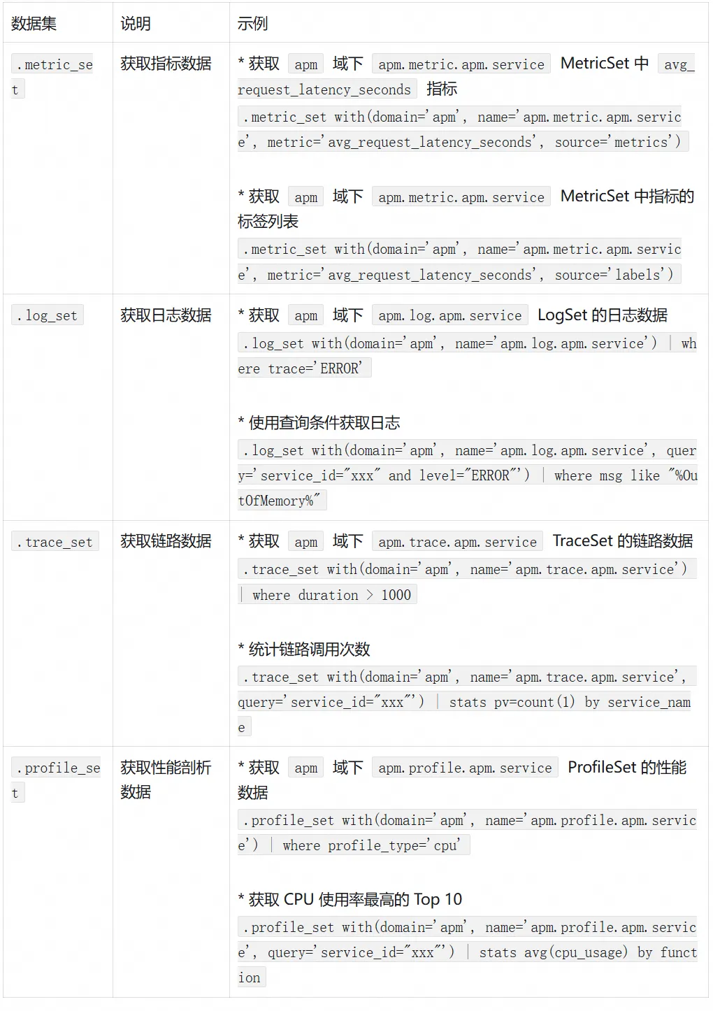 将所有数据——指标、日志、链路、性能剖析——统一抽象成表格结构,所有查询都是针对表格数据进行操作。