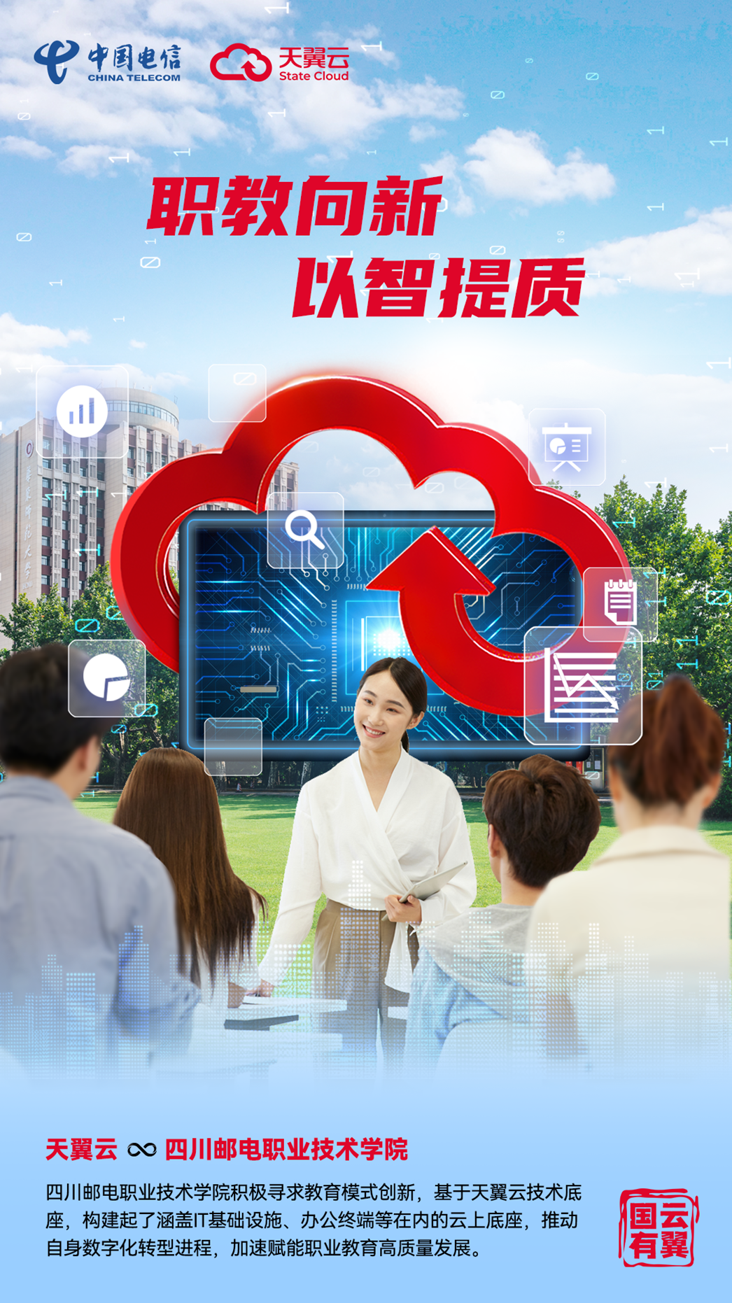 在此背景下,四川邮电职业技术学院(以下简称:四川邮电职院)积极寻求教育模式创新,基于天翼云技术底座,构建起了涵盖 IT 基础设施、办公终端等在内的云上底座,推动自身数字化转型进程,加速赋能职业教育高质量发展。
