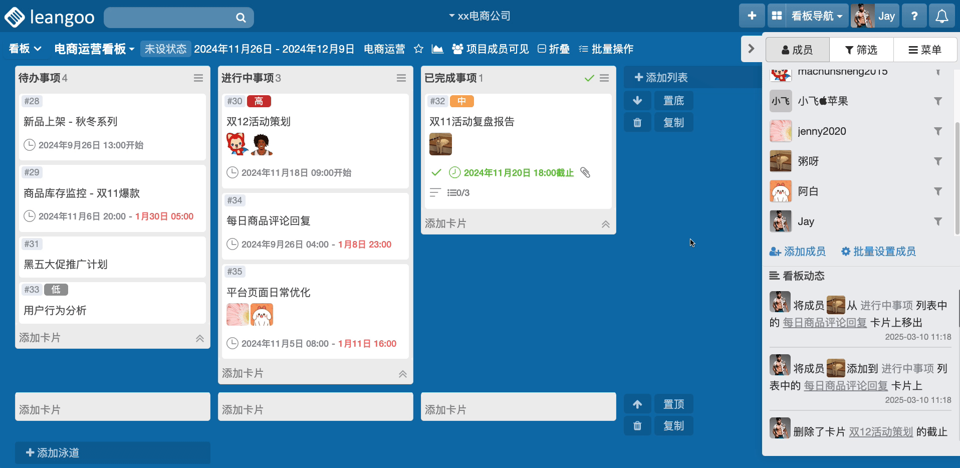项目统计仪表盘:对于多项目并行的管理者,Leangoo 提供了强大的统计视图。从任务分布、成员负载到周期时间,多维度的数据报表自动生成。你可以实时掌握团队的吞吐率,用数据说话,而不是靠直觉决策。