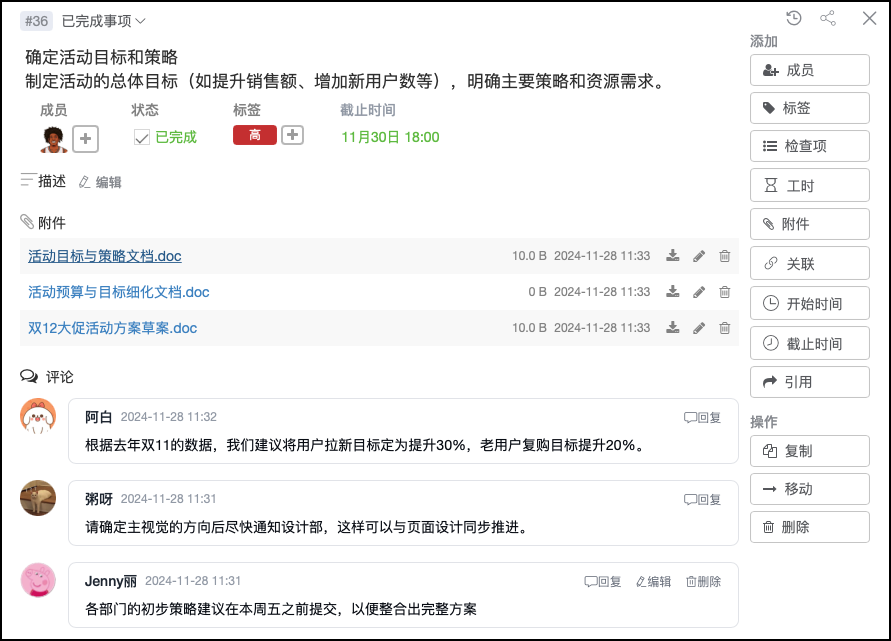 原位评论:所有的需求变更、技术讨论、附件文档,直接在任务卡片内部进行评论和归档。后来者无需翻阅几百条聊天记录,打开卡片即可看到任务的“前世今生”。
