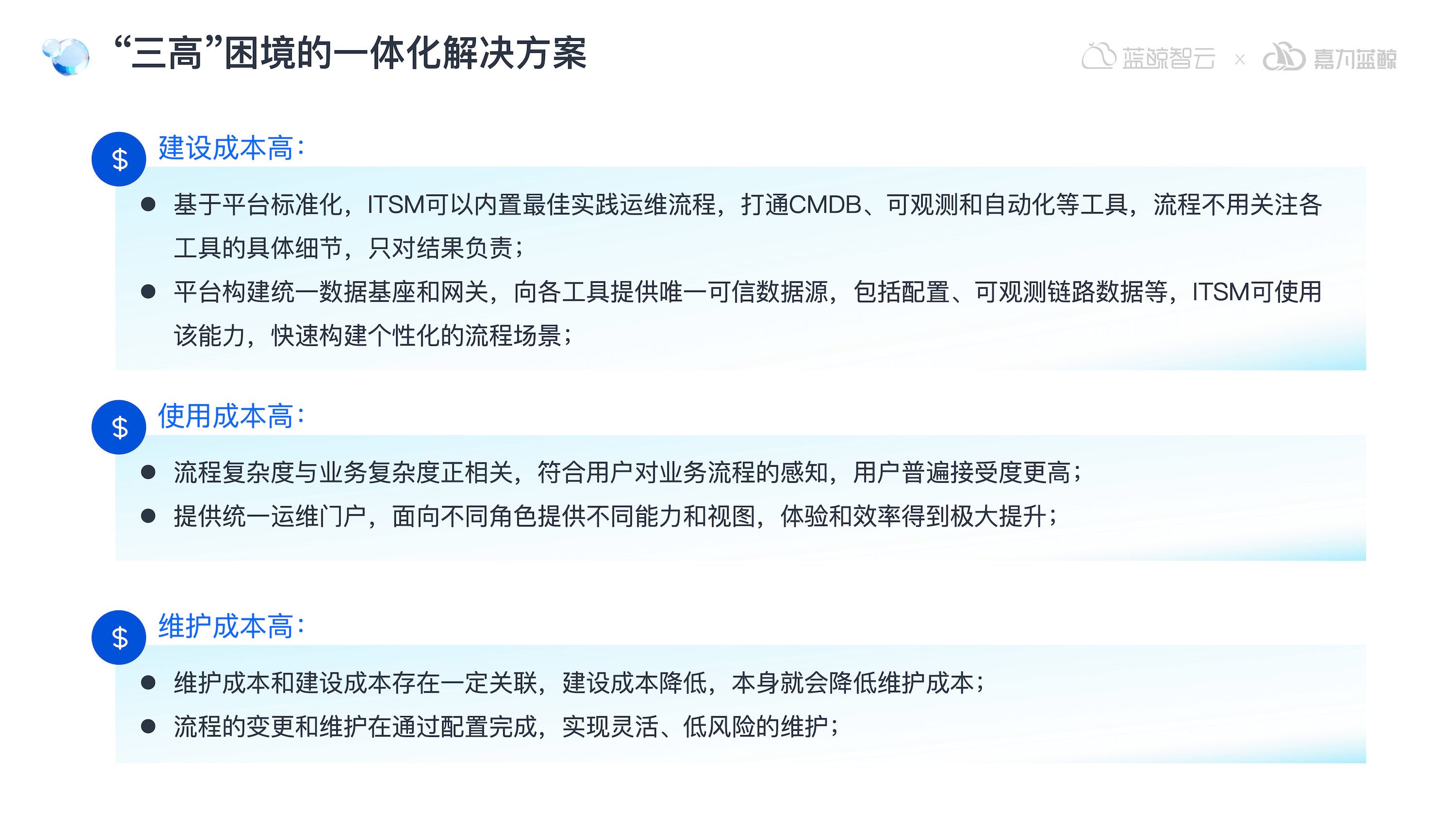 嘉为蓝鲸李超指出,目前 ITSM 串联工具面临“三高”困境:建设成本高、使用成本高、维护成本高。他提出,ITSM 应回归管理服务与流程的本质,而非成为庞大而脆弱的集成工具,运维流程构建需走一体化路径。