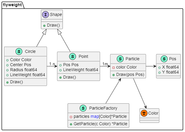在这个例子中,我们通过画点来画圆,我们通过画粒子来画点。粒子包含不变的属性,比如颜色。这个例子很简单,但确实表达了 Flyweight 模式的含义。
