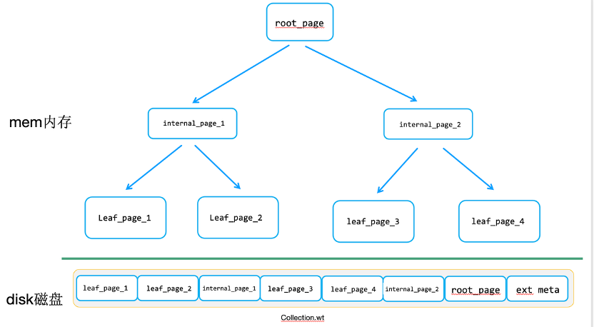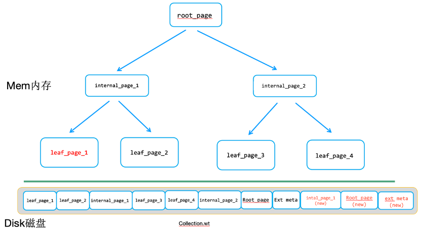 最终两次 checkpoint 后,collection.wt 中包含了两次 checkpoint 的全部用户数据和 ext 元数据,每个 checkpoint 都对应一颗完整的 b+ tree,假设第一次 checkpoint 对应 checkpoint_1,第二次 checkpoint 对应 checkpoint_2, 则: