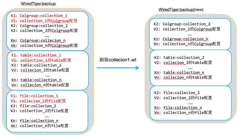假设剔除的表为 collection1, Hotback begin 阶段剔除 collection1 表后,WiredTiger.backup 文件中的内容将不再包含 collection1 的相关内容(这里腾讯云自己对 wiredTiger 做了修改),如下图: