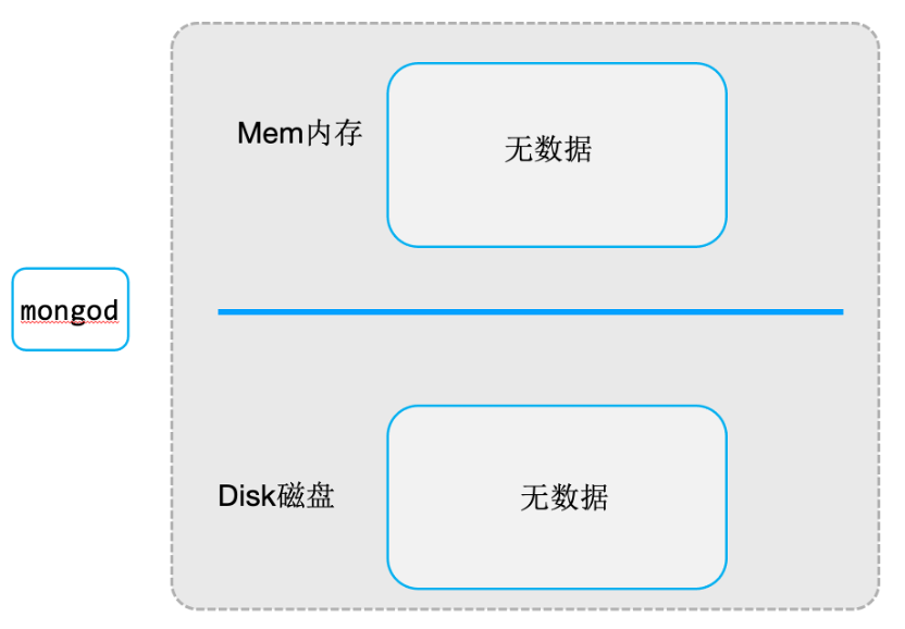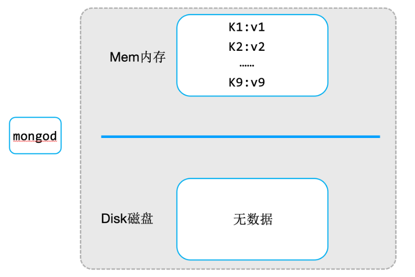 如果这时候机器故障或者 mongod 故障节点挂掉了,重启节点后,由于数据没有持久化到磁盘,因此重启后数据就会丢失,如下图。