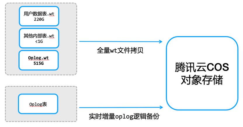 从上面的备份和回档流程可以看出,全量物理备份的时候我们需要拷贝 oplog.wt 到 cos, 下载的时候也需要从 cos 下载这个 oplog.wt 文件。