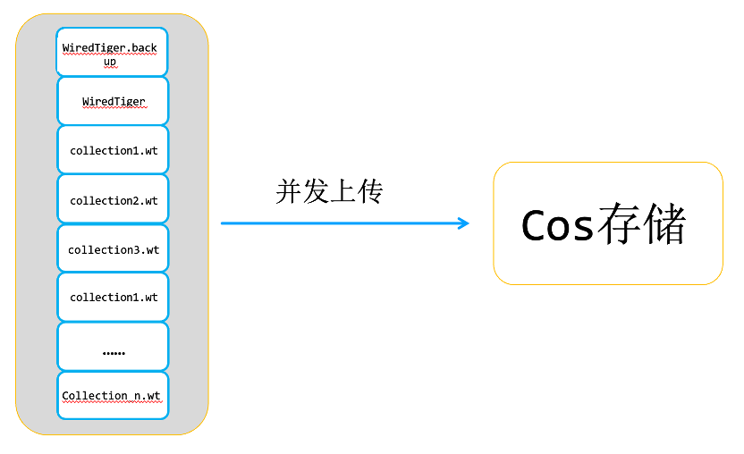 获取到需要备份的 wt 文件后,旁路服务就可以并发拷贝 wt 文件存储到腾讯云 cos 对象存储中(包括 WiredTiger.backup 文件)。